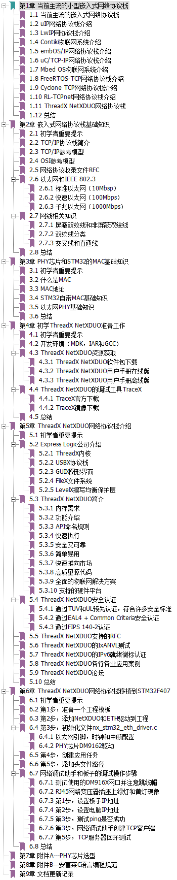 淘宝购买地址:购买地址链接 QQ售后群:70385160(入群口令:淘宝订单号) 从2013年5月份发布至今,开发板硬件更新过6个版本,软件资料更新过121次,当前标准库最新版本V8.8,HAL库最新版本V4.8,最近一次更新于2021-08-16。 安富莱微信公共平台,欢迎大家关注(打造高质量公众号)。 ![]() ![]() ![]() ![]() ![]() HAL库版V4.8 STM32-V5开发板HAL库版百度网盘全下载(2021-08-16) 链接:https://pan.baidu.com/s/1XquuAHLui3t6WqctxBceDg 提取码:itg0 标准库版V8.8(2019-08-02) 链接:https://pan.baidu.com/s/1zJxNKA6GnMNdxDKl5bDe6A 提取码:mhdy 入门视频: 链接:https://pan.baidu.com/s/1D4bkanB2UfWmRqqmWVDsig 提取码:mh9v 开发工具盘: http://www.armbbs.cn/forum.php?mod=viewthread&tid=100027 STM32F407开发板的11期入门高清视频教程发布,带字幕哦,欢迎观看 http://www.armbbs.cn/forum.php?mod=viewthread&tid=15408 ![]() 第1个综合设计Demo:基于uCOS-III+STemWin+FatFS+ARM_DSP_Lib的一代示波器演示(26分钟),支持1080p和超清观看 www.armbbs.cn/forum.php?mod=viewthread&tid=3886 ![]() 第2个综合设计Demo:花式玩转网络摄像头之TCP上位机软件实现,高端大气上档次,速度2MB/S,华丽丽的界面效果。 www.armbbs.cn/forum.php?mod=viewthread&tid=87016 ![]() 纯RGB格式数据,上传速度2MB/S左右,下面是动态GIF。 ![]() 第3个综合设计Demo:花式玩转网络摄像头之VNC远程桌面版本,稳定运行2年不死机,手机端和电脑端均可访问。 www.armbbs.cn/forum.php?mod=viewthread&tid=87362 ![]() 动态GIF,运行时,图像有时候会有错位,这个是因为F4性能有些跟不上了,不同步。 ![]() 手机访问效果如下,比较占用带宽,需要1MB/S。 ![]() ![]() CPU型号STM32F407IGT6/LQFP-176,1M字节Flash,192K字节RAM 25MHz晶振作为MCU的主时钟,32.768kHz晶振用于CPU的RTC 2M字节SRAM(高速SRAM),16M字节NOR Flash,128M字节NAND Flash 8M字节串行Flash,16K字节串行EEPROM 1个MicroSD卡座 2个CAN2.0接口(SN65HVD230) 1个RS232串口(SP3232) 1个RS485接口(SP3485) 1个USB2.0全速DEVICE接口(CPU内部集成) 1个USB2.0全速HOST接口(CPU内部集成) 2个100M/10M以太网接口(DM9000AE挂在FSMC总线+DM9161 PHY使用CPU内部MAC)【双网卡】 集成I2S全双工音频CODEC芯片(WM8978) 集成AM/FM收音机模块(Si4704)——(比通用的TEA5767 FM芯片高级) 集成三轴陀螺仪(MPU-6050) 集成光照度传感器(BH1750FVI) 集成气压强度传感器(BMP180) 板载1个咪头,1个扬声器,1个立体声耳机输出插座,1个麦克风输入插座,1个Line线路输入插座 1个红外遥控接收,1个红外遥控发射 1个5向摇杆,1个Reset按键、3个软件可支配的按键 4个LED,1个电源LED 1个CR1220电池座 1个PS/2插座,可外接PS/2键盘或鼠标 SWD调试接口(配SWD转接板) 2种供电方式:USB电缆、外接7-32V电源 1个电源开关,上下电时无需拔插电缆 SDIO WIFI模块扩展接口(不带外部模块) HMC5883L三轴磁力计扩展接口(不带外部模块) ESP8266串口WIFI模块扩展接口(不带外部模块) nRF24L01 2.4G无线通信模块扩展接口(不带外部模块) nRF905 433M无线通信模块扩展接口(不带外部模块) 摄像头模块扩展接口(不带外部模块) ADC-DAC示波器模块扩展接口(不带外部模块) AD7606八通道ADC采集模块扩展接口(不带外部模块) GPS模块扩展接口(不带外部模块) GPRS无线通信模块扩展接口(不带外部模块) DS18B20温度传感器扩展接口(不带外部模块) DTH11温湿度传感器扩展接口(不带外部模块) 主板尺寸:192mm×140mm PCB板厚度:1.6mm,双面板 ![]() ![]() ![]() (建议下载后观看,视频分辨率是1024*768的,本地观看很清晰,百度云在线视频不清晰) 视频目录如下: 第1章:Cortex-M内核基础介绍 (33分钟48秒) 1.1 主流嵌入式处理器内核 1.2 ARM介绍 1.3 Cortex-M内核介绍 1.4 Cortex-M内核的优势及其应用 1.5 ARM资源获取 第2章:STM32基础介绍 (50分钟17秒) 2.1 ST意法半导体介绍 2.2 STM32系列产品 2.3 STM32生态系统 2.4 STM32资源获取 2.5 STM32的几个重要文档 第3章:STM32-V5开发板软件硬件介绍(29分钟40秒) 3.1 STM32-V5开发板硬件介绍 3.2 主控STM32F407IGT6简介 3.3 STM32-V5开发板软件介绍 3.4 STemWin书籍 3.5 开发板资源获取 第4章:开发环境搭建(48分钟10秒) 4.1 IDE介绍及其安装 4.2 JLINK和串口驱动安装 4.3 开发板硬件搭建 4.4 程序下载 4.5 串口打印 第5章:裸机例程介绍和MDK工程配置(56分钟43秒) 5.1 裸机例子基础篇和高级篇介绍 5.2 内存映射 5.3 例程的文件夹和工程结构说明 5.4 MDK工程配置 第6章:创建MDK工程(39分钟49秒) 6.1 创建工程文件说明 6.2 创建MDK工程 6.3 MDK工程配置 6.4 工程下载 第7章:标准固件库简易说明(71分钟49秒) 7.1 标准固件库文件介绍 7.2 标准固件库简单剖析 7.3 选择寄存器开发还是库开发 7.4 CMSIS微控制器软件接口介绍 第8章:STM32启动代码讲解(57分56秒) 8.1 上电复位和手动复位介绍 8.2 不同系列对应不同启动文件 8.3 MDK中help文档的使用 8.4 启动代码讲解 第9章:STM32三种启动方式讲解(59分23秒) 9.1 三种启动方式总述 9.2 存储器重映射(重要) 9.3 从Flash启动 9.4 从内嵌SRAM启动 9.5 从系统存储器启动 第10章:数据类型,变量和堆栈(57分钟08秒) 10.1 数据类型 10.2 局部变量和全局变量 10.3 堆栈 10.4 局部变量,全局变量和堆栈实例 第11章:MDK生成的map和htm文件分析(44分钟55秒) 11.1 map文件分析 11.2 htm文件分析 ![]() 说明: 1、本教程重在BSP驱动包设计方法和HAL库的框架学习,并将HAL库里面的各种弯弯绕捋顺,从而方便我们的程序设计。 2、由于是基于HAL库的文档,所以不限制F4系列,其它F1,F2,F3,H7,F7等系列通用。 3、本次工程延续以往的代码风格,从底层BSP驱动包到应用代码,变量命名,文件命名,程序框架,